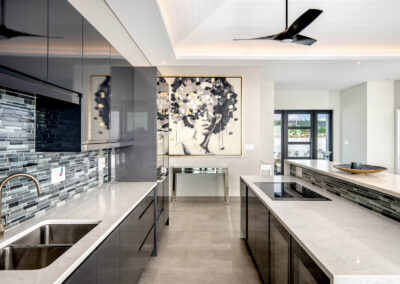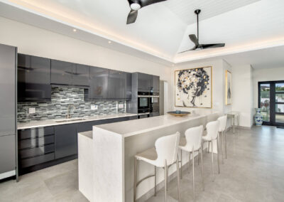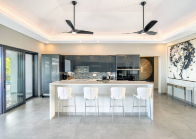 A chef’s haven awaits in the superbly appointed kitchen. Featuring a large central island and top-of-the-line Miele appliances, this culinary haven caters to both intimate meals and grand gatherings. Prepare tropical feasts while enjoying the stunning west coast vista, making every cooking experience a delight.