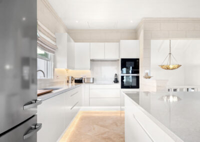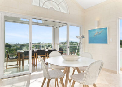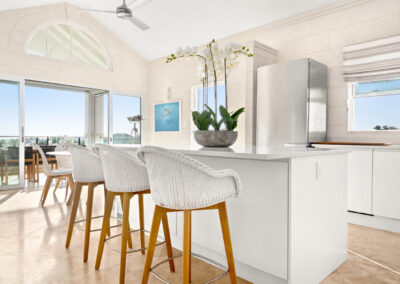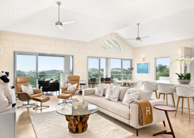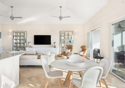The heart of each Mahogany Heights townhouse is the expansive, light-filled living area on the first floor. Berkan Construction Services’ focus on precise construction translates into seamless integration of large, sliding glass doors. This design element creates a captivating open-plan space, effortlessly connecting the elegantly modern living and dining areas to the covered south-facing terrace. Here, residents can fully immerse themselves in the breathtaking fairway and ocean views, creating a truly luxurious living environment.